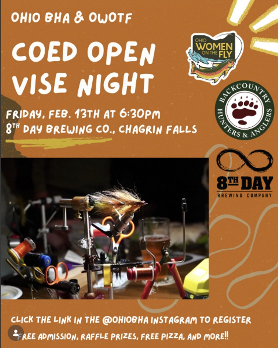 @ohiobha and OWOTF are excited to team up for a FREE, coed Open Vise Night on February 13, 2026, from 6:30–9:00 PM at 8th Day Brewing Company in Chagrin Falls, OH! Whether you’re a seasoned fly-tying pro or brand new and just curious, all skill levels are welcome. We’ll have free pizza, plus awesome raffle prizes from Mad River Outfitters and more. Anyone who joins or renews their BHA membership will also score a FREE Ohio BHA T-shirt! Please bring your own vise and materials if you have them- limited extras will be available. Not into fly tying? No problem! Come hang out, grab a drink, and talk fishing with great folks. 😊